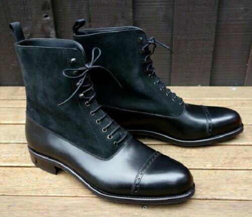 Handmade Men’s Black Suede Lace Up Boots,Leather High Ankle Cap Toe Boots