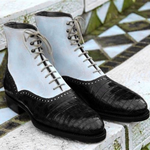 Handmade Men Boots, Formal Crocodile Texture Leather Suede Men Black White Boot