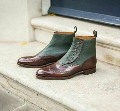 Handmade Button Boot brown and green leather boots, ankle high boots for men