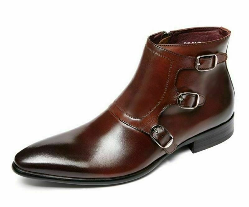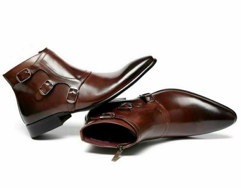 Men's Handmade Boots Brown Triple Monk Leather Ankle Formal Wear Casual Shoes