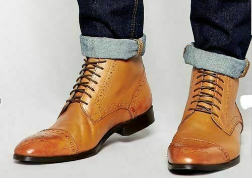 HANDMADE MEN TAN ANKLE HIGH BOOTS, MENS STYLISH GENUINE LEATHER BOOT