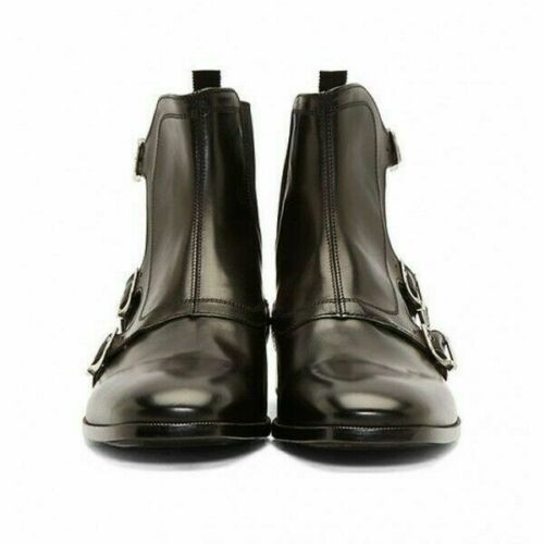 Men Black Monk Triple Buckle Straps Derby Toe High Ankle Leather Handmade Boots