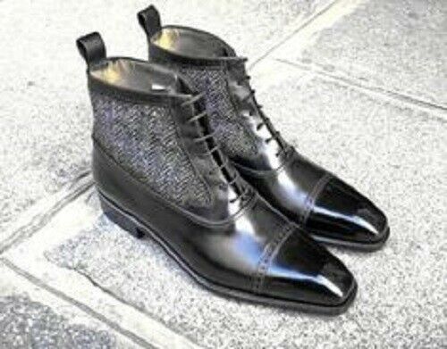 Handmade Grey Tweed Ankle Boot Men's Leather Formal Dress Black Leather Boots