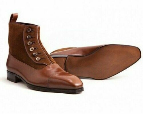 Men High Ankle Two Tone Brown Derby Cap Toe Genuine Suede Leather Button Boots