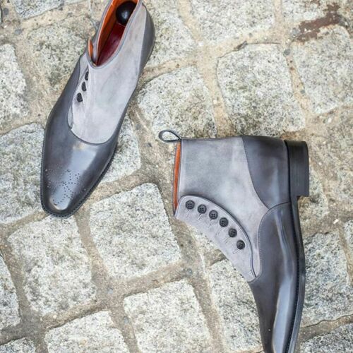 Men's Gray Suede Black Classic Style High Ankle Vintage Leather Button Boots