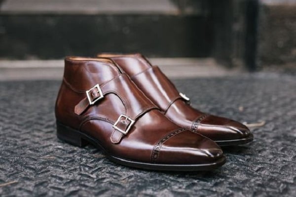 Handmade Men Brown Double Monk Strap Round Toe Dress Boots, Real Leather