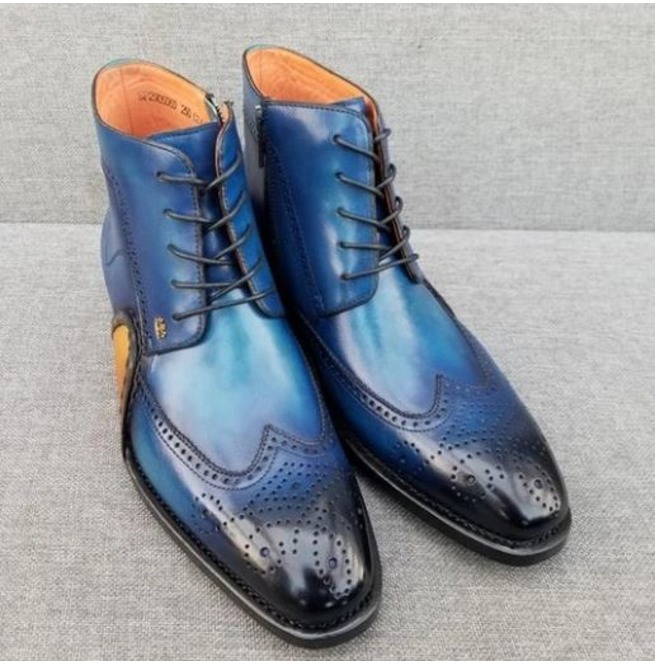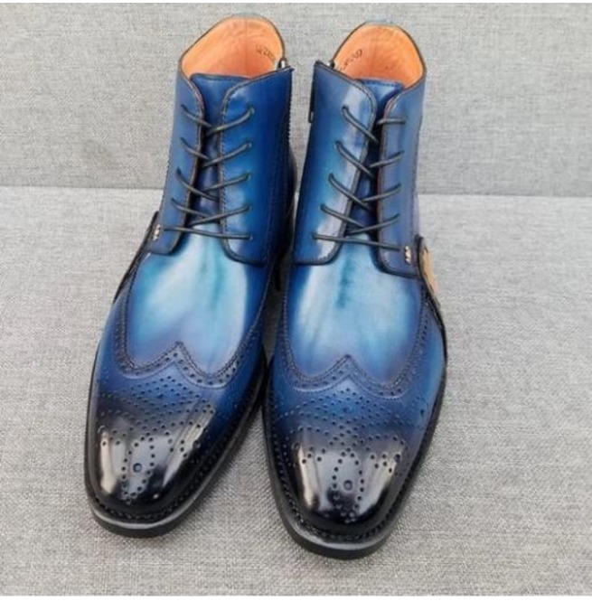 Men Blue Wing Tip Brogue Round Toe Lace Up High Ankle Dress Leather Boots