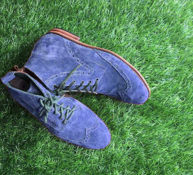 Men Blue Suede Oxfords Wingtip Beautiful Finishing Handmade Lace Up Ankle Boot