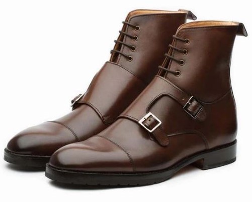 Handmade Men's Brown Cap Toe Leather Boots, Men Lace Up Double Monk Strap Boots