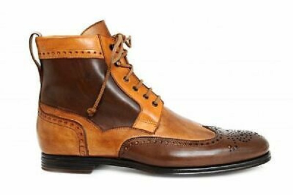 Two Tone Tan Brown Brouging High Ankle Men Lace Up Premium Quality Leather Boots