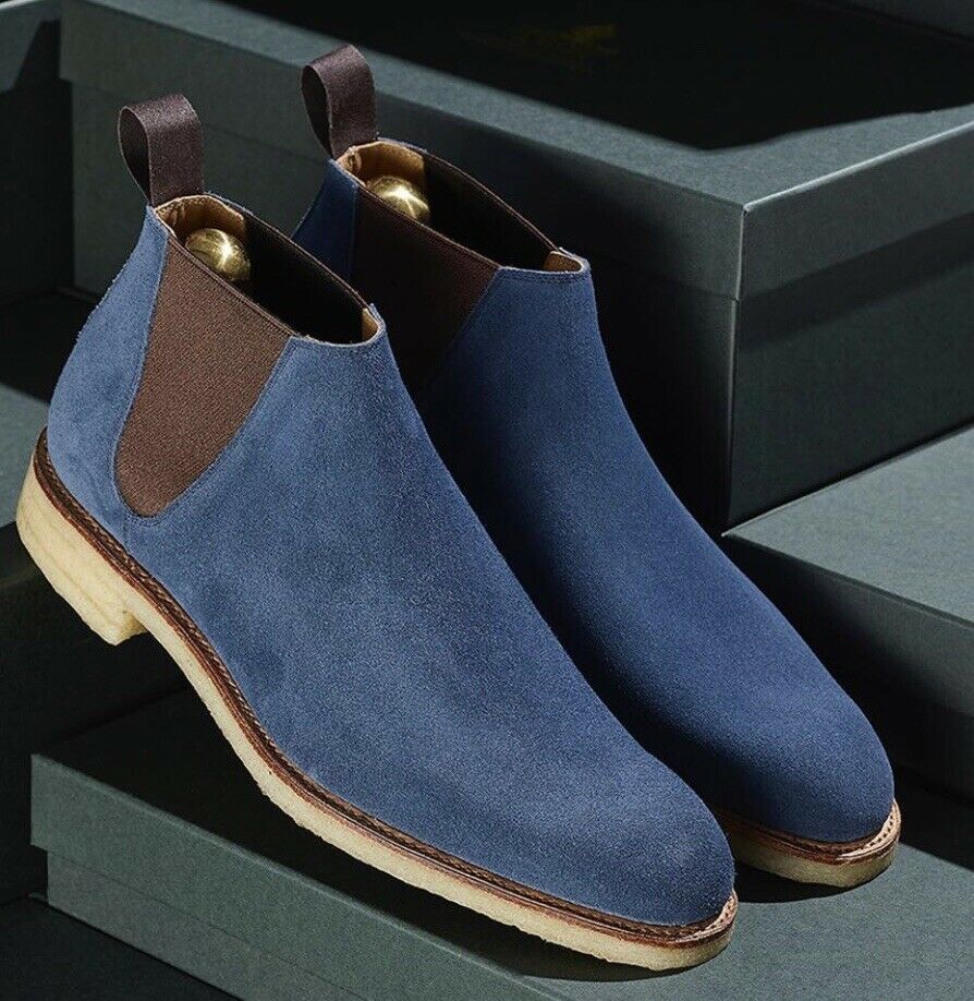 New Handmade Chelsea Suede Pure Leather Blue Ankle Boots for Men's