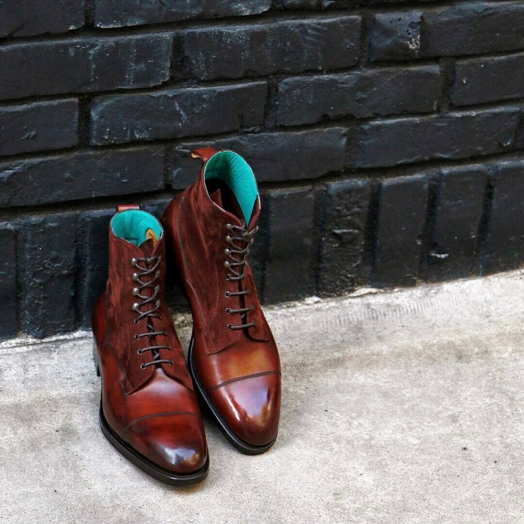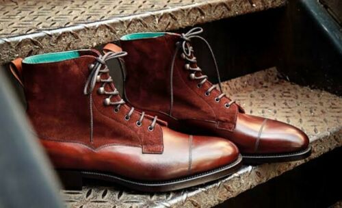New Men's Handmade two tone Leather and suede Cap Toe Ankle High lace Up Boots