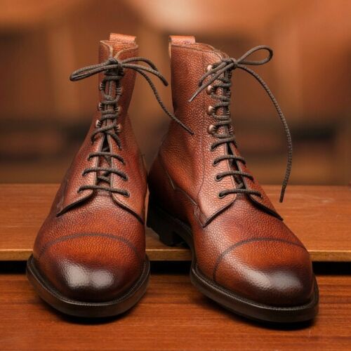 New Men Handmade Leather burnished Cap Toe Ankle High lace Up Boots