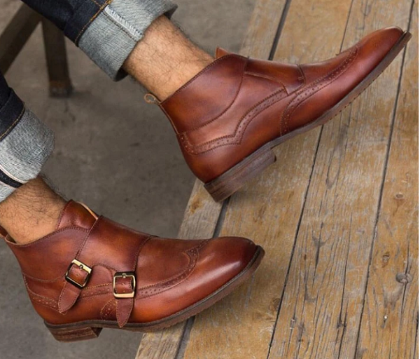 Handmade Mens wing tip brogue double monk Chukka boots, Men casual ankle boot