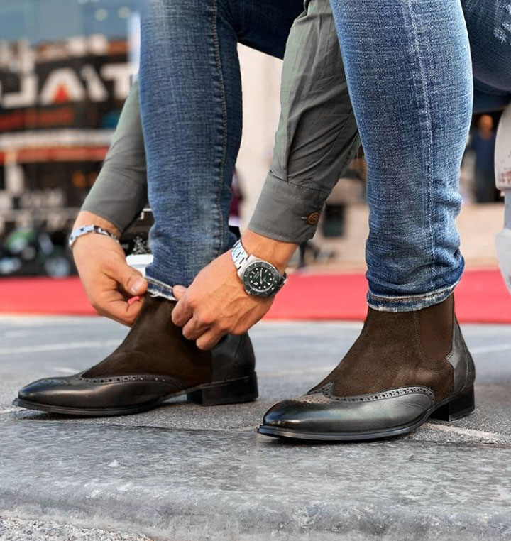 Men Black Brown Wing Tip Brogue Chelsea Leather Suede Boot
