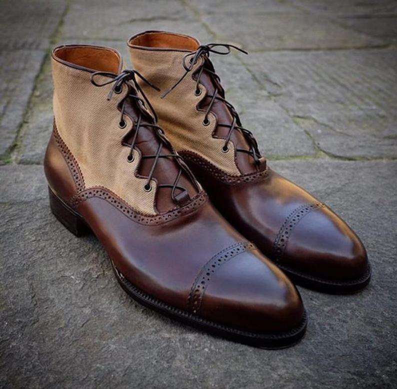 New Handmade Tweed & Dark Brown Leather Ankle Boots for Men's