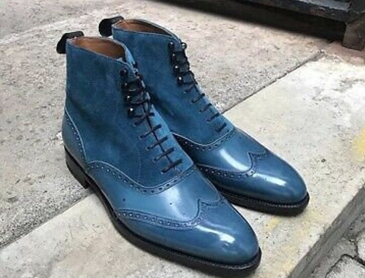 New Handmade Bluish Suede & Leather Ankle Boots for Men's
