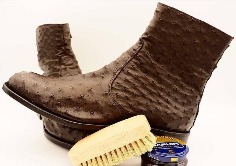 New Handmade Pure Brown Textured Leather & Brown Ostric Brown Textured Leather & Brown Ostrich Leather Cowboy Boots for Men's