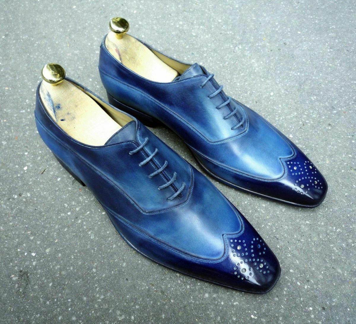 Oxford Two Tone Blue Wing Tip Real Leather Lace Up Shoes Men Formal Dress Shoes
