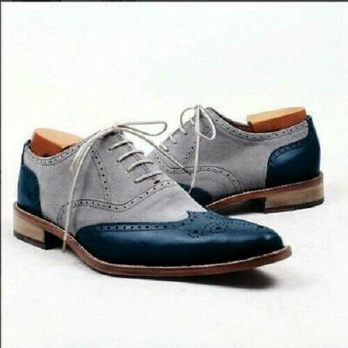 Gray Blue Tan Sole Brogues Toe Premium Leather Lace Up Men Oxford Shoes