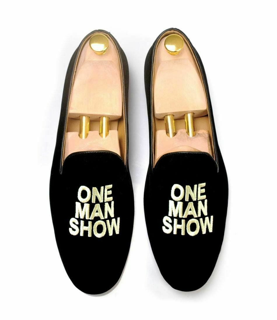 Mens Handmade Shoes Black Velvet Embroidered Slipper One Man Show Slip-on Loafer