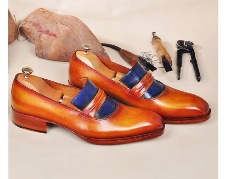 NEW HANDMADE MEN’s LEATHER LUXURY HANDPOLISHED TAN & BLUE MENS LOAFERS SHOE