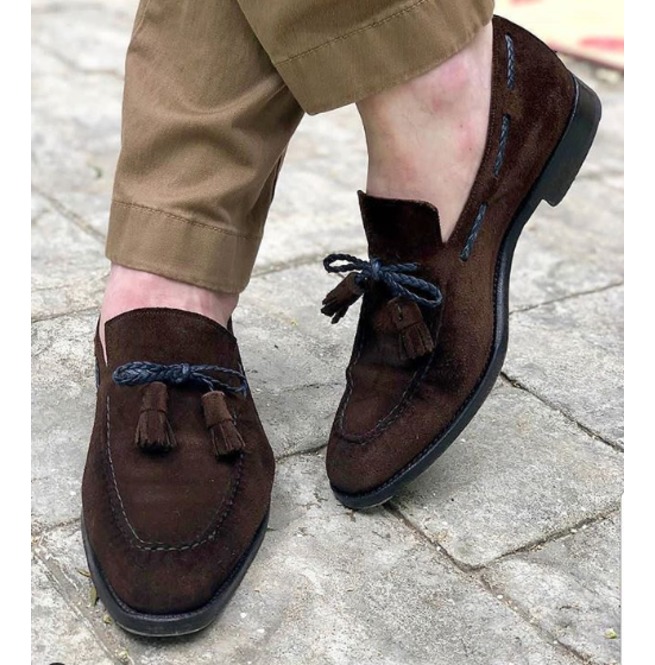 Handmade Chocolate Brown Suede Shoes, Men Tassel Moccasin Shoes, Dress
