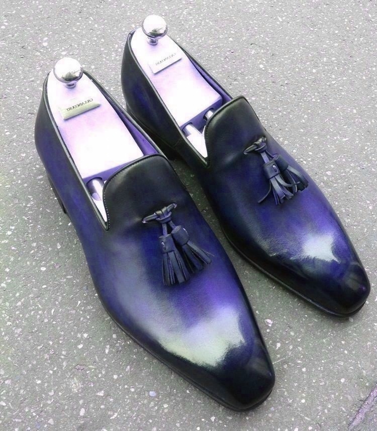 Loafer Tassels Slip On Blue Burnished Leather Handmade Men Luxury Dress Shoes