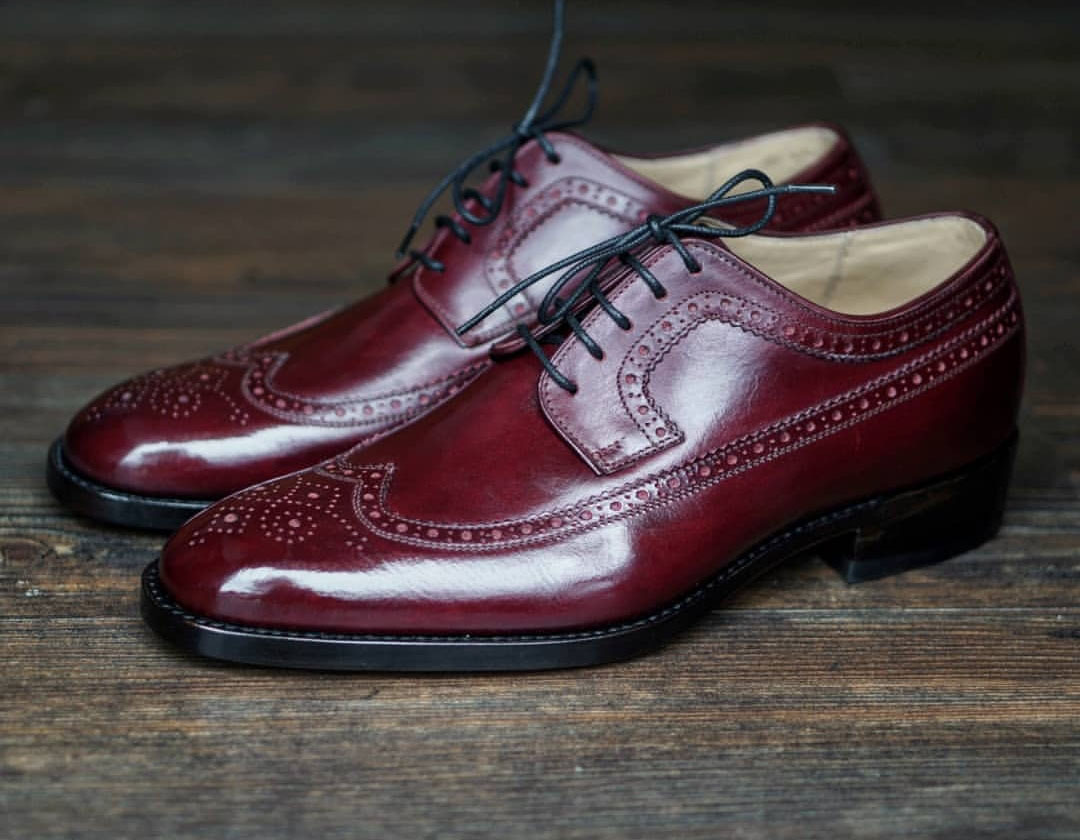 Men’s Handmade Burgundy Leather Shoes, Men Wing Tip Brogue Dress Formal Shoes