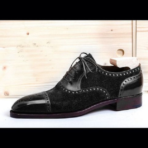 Men's Handmade Cap To Classic Black Leather Suede Wing Tip Lace Up Formal Dress Leather Shoes