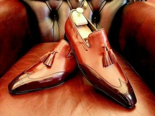 Handmade Men's wing Tip Brogue Slip On Business Dress Shoes Real Leather Shoes
