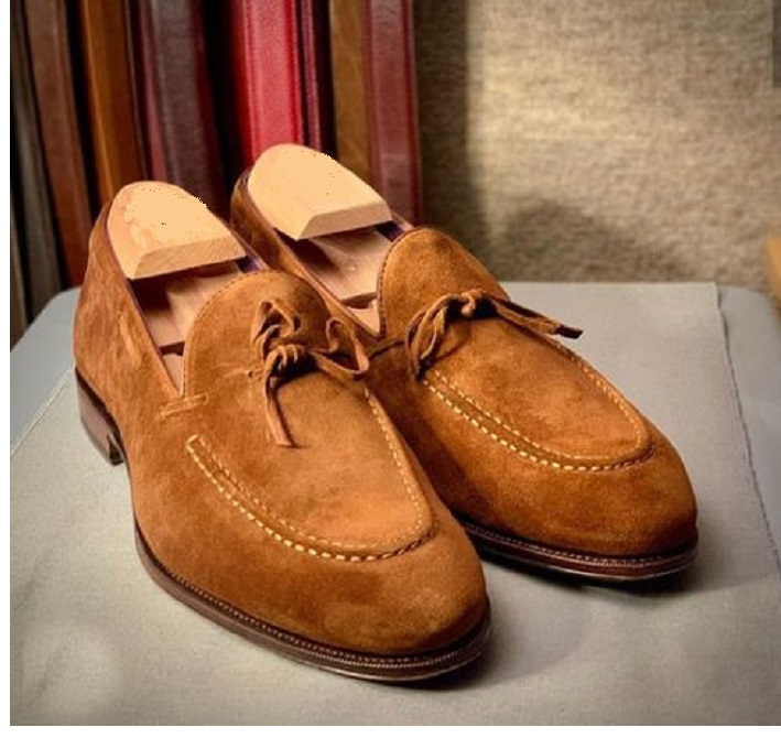 Handmade Tan Brown Suede Round Toe Tussles Dress Formal Shoes for Men's`