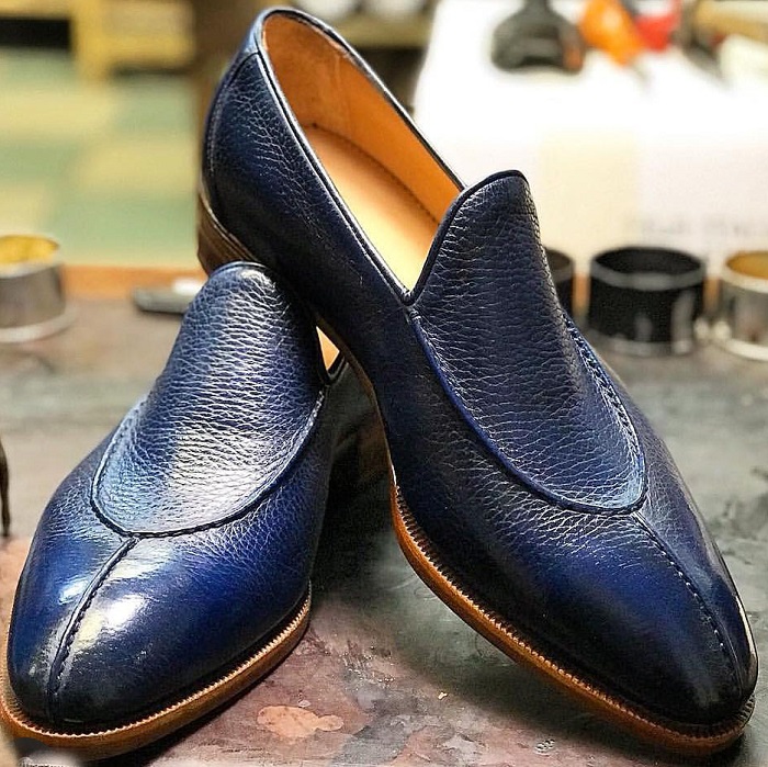 New Handmade Blue Split Toe Pebbled Leather Round Toe Lace Up Shoes for Men's`