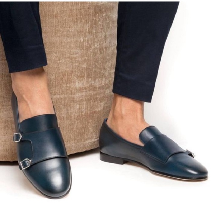Handmade Mens Navy Blue Round Toe Monk Shoes, Men Blue Dress Shoes