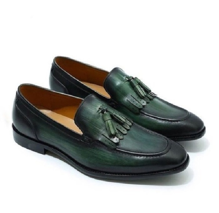 Men's Handmade Green Colour Leather Shoes, Men’s Round Toe Fringe Tussles Loafer