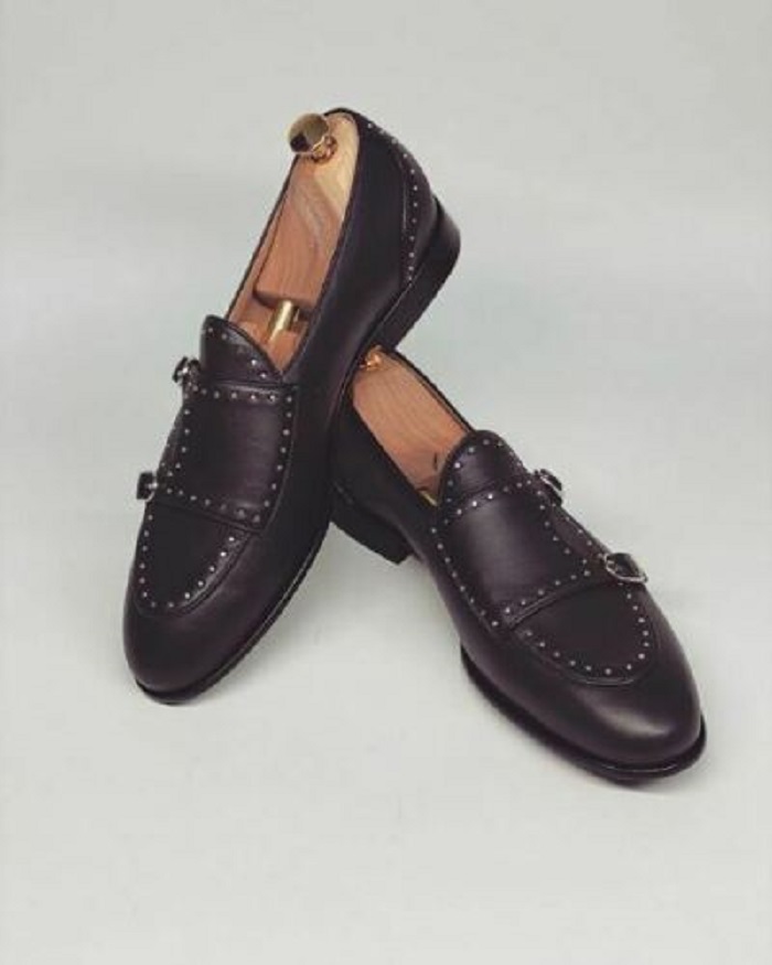 Handmade Men Black Double Monk Strap Brogue Dress Business Leather Shoes