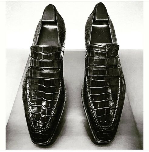 Handmade Mens Black Crocodile embossed Leather shoes, Moccasins for men