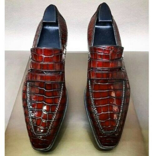 Handmade Mens burgundy Crocodile embossed Leather shoes, Moccasins for men