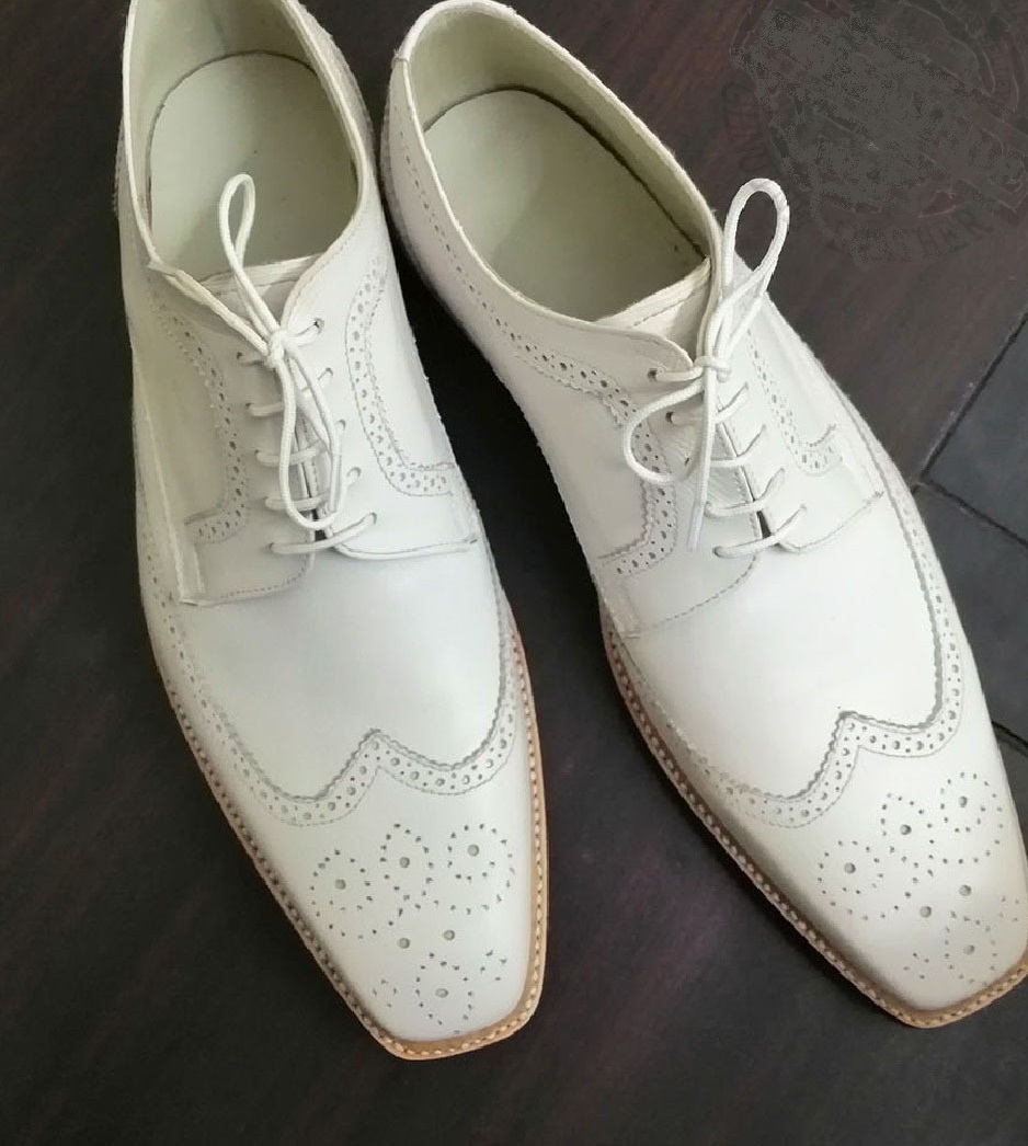 Fashionable DERBY In Classy White Full Brogue Premium LEATHER Men Dress Shoes