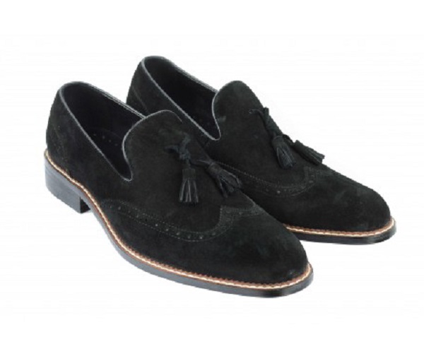 Tassel Loafer Slip On Black Real Suede Leather Derby Toe Handmade Wing Tip Shoes