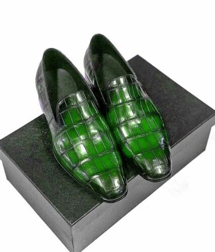 Handmade Men's Genuine Green Leather Crocodile Print Moccasins Loafer Shoes