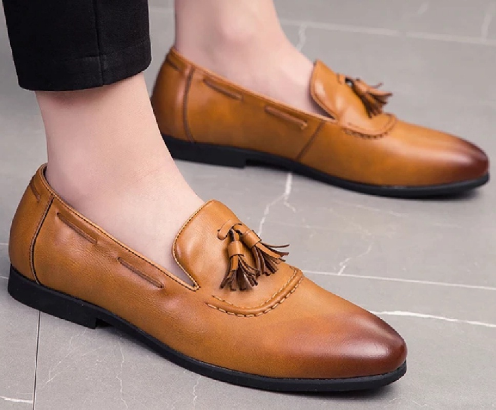 Men Tassel Loafers Tan Patina Genuine Leather Handmade Pull On Formal Shoes