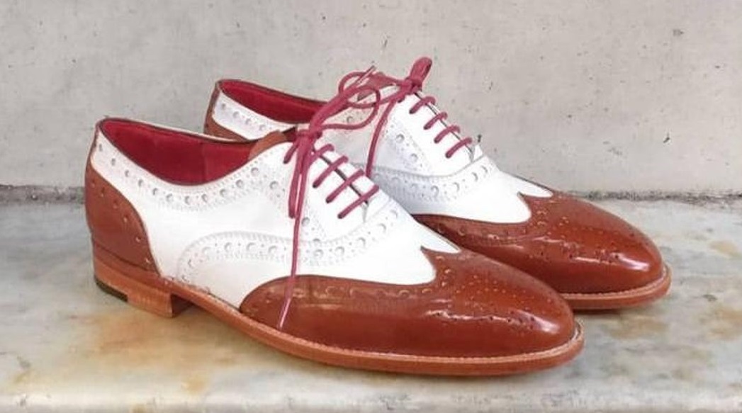 New Pure Handmade White & Tan Leather Lace up Brogue Shoes for Men's