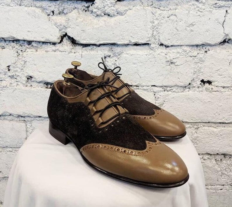 Pure Handmade Brown Suede & Dark Beige Genuine Leather Lace up Shoes for Men's