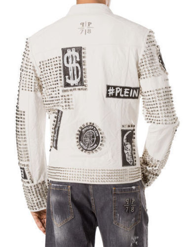 Christmas Party Men Punk Full White Studded Embroidery Patches Leather Jacket