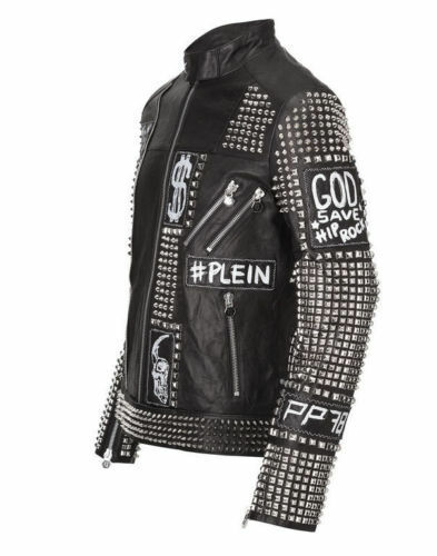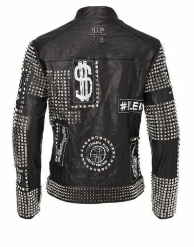 Mens Handmade Jacket Fashion Black Leather Punk Plein Style Studded Biker Casual