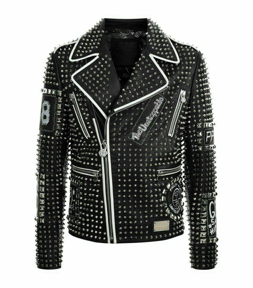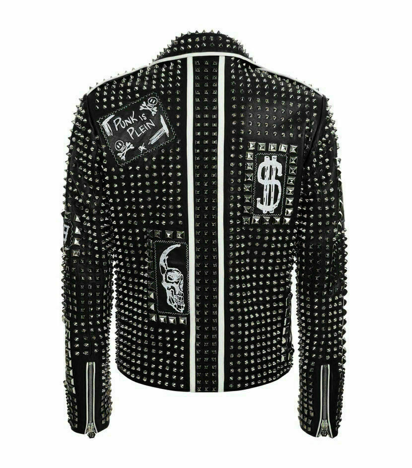 Mens Punk Biker Full Black Studded Embroidery Patches Leather Jacket