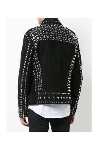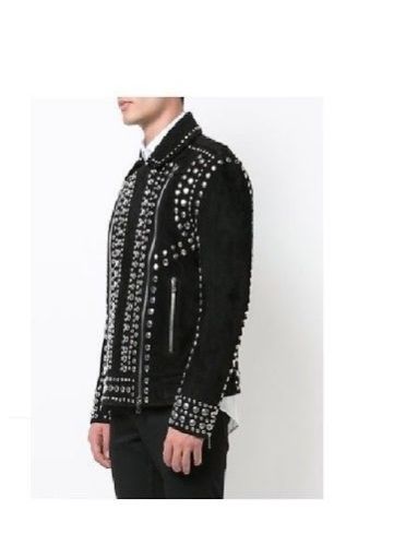 New Mens Black Full Silver Studded Rivets Brando Zipper Suede Leather Jacket