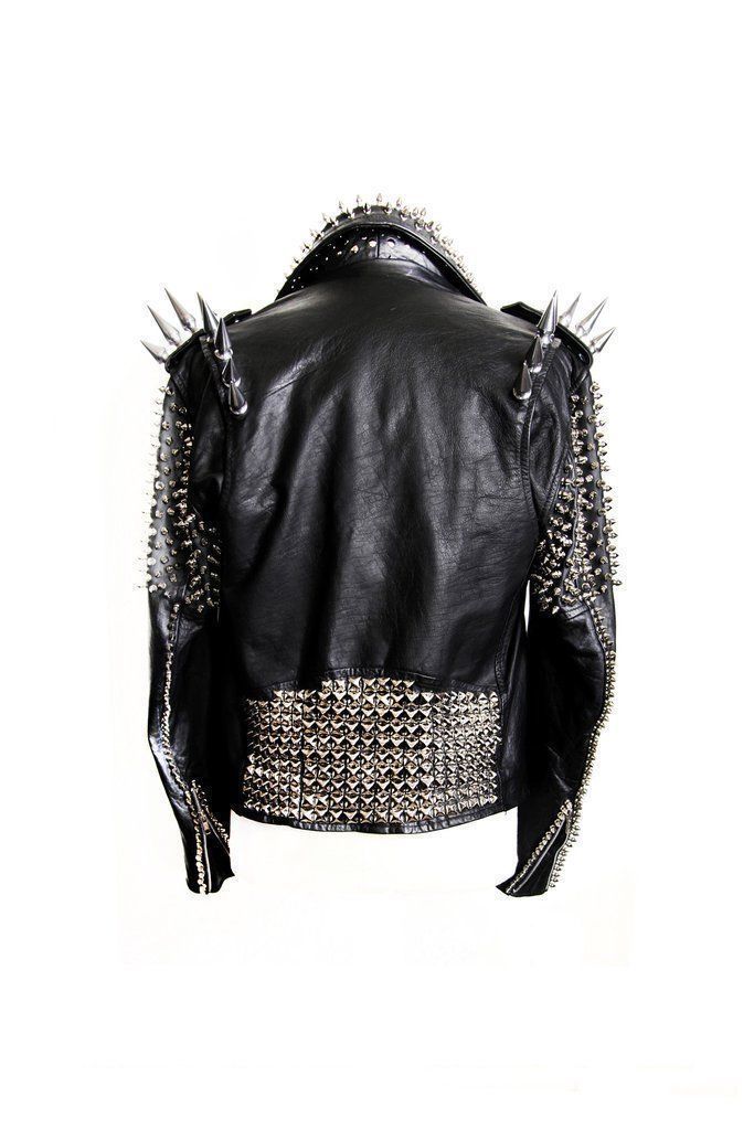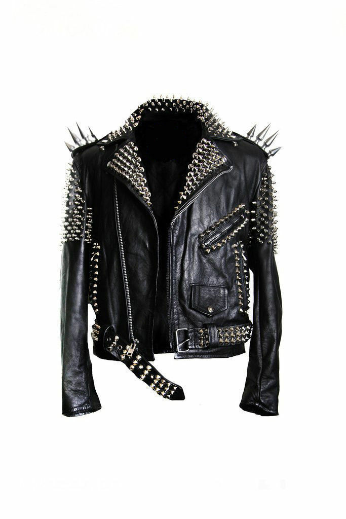 New Mens Full Black Punk Silver Long Spiked Studded Cowhide Leather Jacket