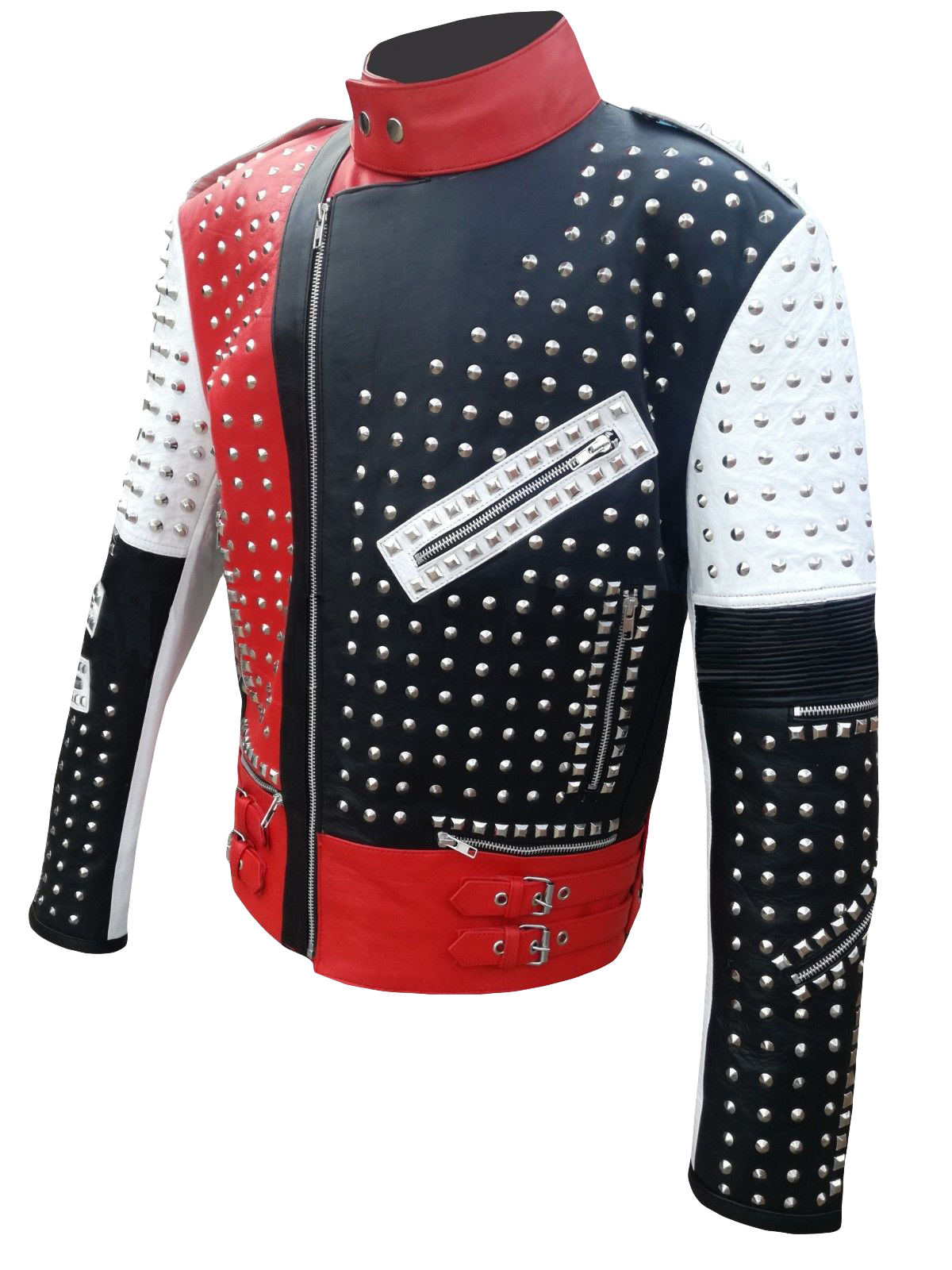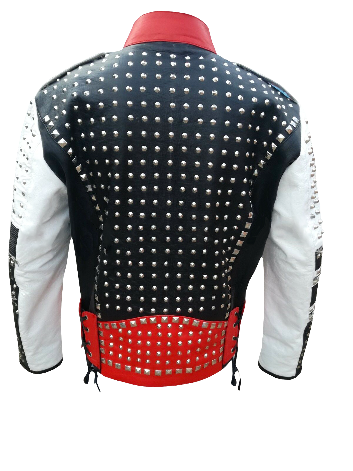 Mens Leather Jacket Red Black Punk Full Silver Spiked Studded Zippered Jacket